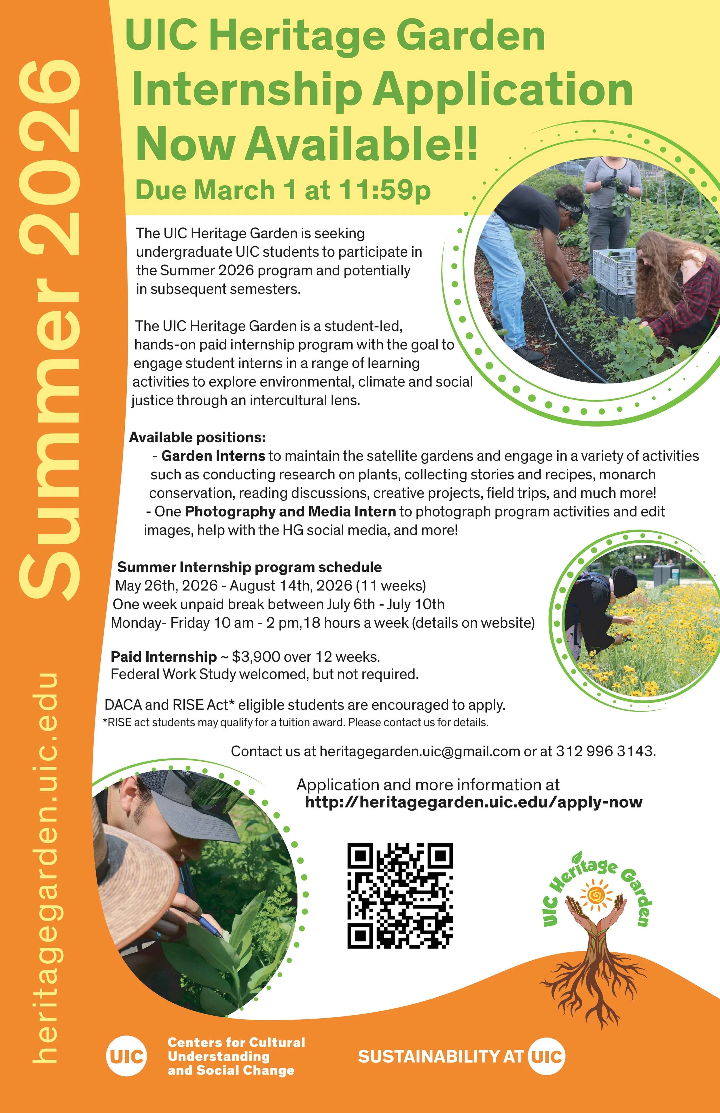 The Heritage Garden is a collaborative project between the seven Centers for Cultural Understanding and Social Change(CCUSC/Centers), under the Office of Diversity, Equity & Engagement at UIC. Founded as a direct result of campus activism, the Centers work collectively to produce knowledge and shift university culture, validating the multidimensional lived experiences of historically and currently excluded communities. Informed by social justice frameworks, the Centers support students, faculty, and staff as they build a strong identity and sense of belonging, becoming change agents for a more just campus and society. The Centers connect our communities and design intercultural and engaged-learning opportunities, student mentorship programs, cultural programming, advocacy, collaborative research, and community partnerships. Through these efforts, the Centers expand the educational and transformational mission of UIC.